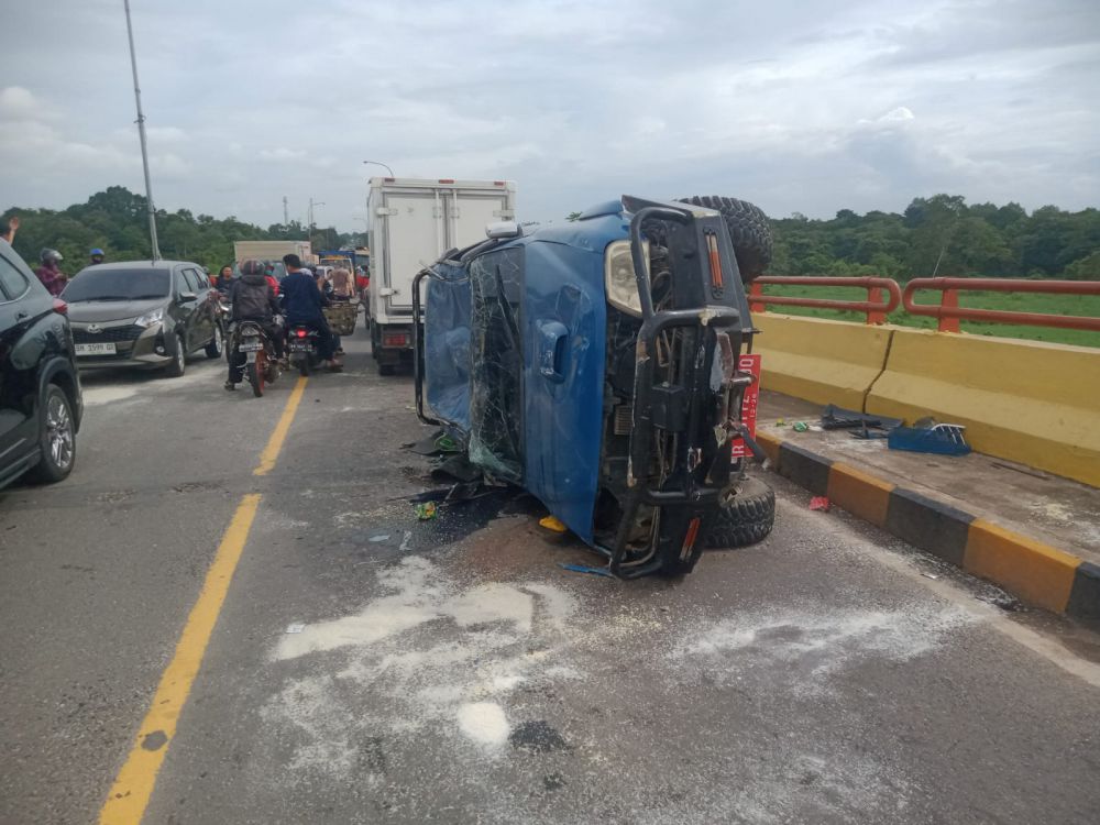 Dari pantauan di lokasi kejadian, mobil plat Dinas Kemensos berwarna biru itu terguling di tengah Jembatan Aur Duri II. Mobil tersebut diketahui datang dari arah Sijenjang hendak menuju ke Seberang, Niaso.