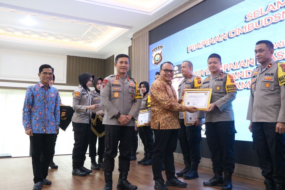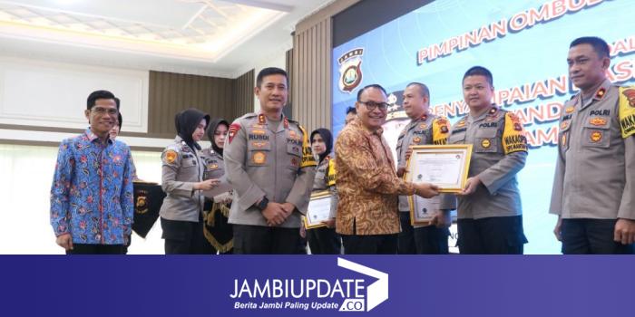 JAMBIUPDATE.CO, JAMBI- Kepolisian Daerah (Polda) Jambi dan jajaran terima hasil penilaian Kepatuhan Standar Pelayanan Publik tahun 2023 dari Ombudsman Republik Indonesia. Penyerahan hasil penilaian ini, diserahkan langsung oleh anggota Ombudsman RI, Robert Na Endi Jaweng, bertempat di aula gedung Siginjai Polda Jambi, pada Rabu (7/2).Kegiatan ini dihadiri langsung oleh Kapolda Jambi beserta jajaran serta Kepala Perwakilan Ombudsman RI Provinsi Jambi.