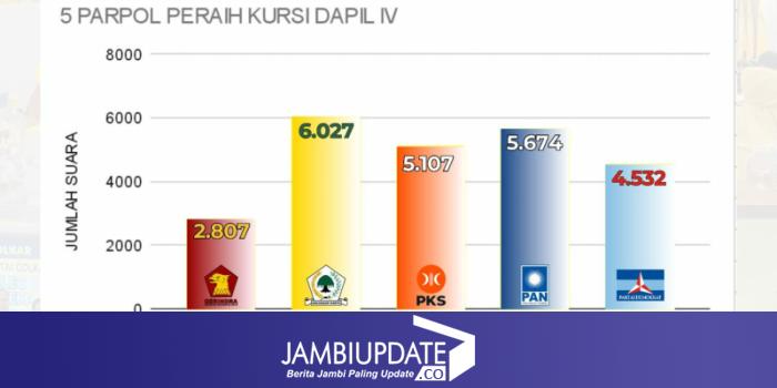 Terakhir ada Gerindra yang mendapatkan 1.910 suara di Kecamatan Danau Kerinci, Tanah Cogok 489 suara, Sitinjau Laut 173 suara dan Batang Merangin 235 suara.