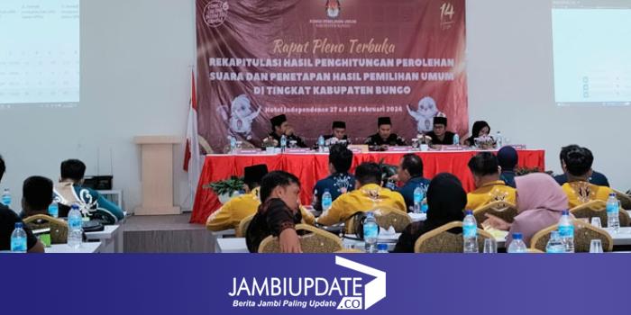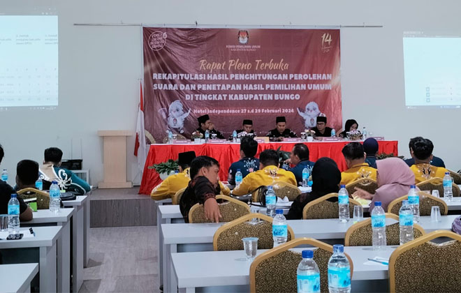 JAMBIUPDATE.CO, MUARA BUNGO- Komisi Pemilihan Umum (KPU) Kabupaten Bungo mulai menggelar rapat pleno terbuka rekapitulasi hasil penghitungan perolehan suara dan dan penetapan hasil untuk Pemilu 14 Februari lalu.