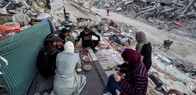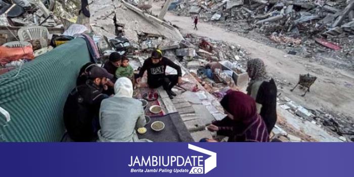 JAMBIUPDATE.CO,- Saat salat magrib dikumandangkan di reruntuhan Gaza, keluarga Abu Rizek berbuka puasa dengan makan bersama di reruntuhan rumah mereka. Kesedihan meliputi keluarga ini, mengingat semua yang telah hilang akibat agresi militer Israel sejak Oktober lalu.