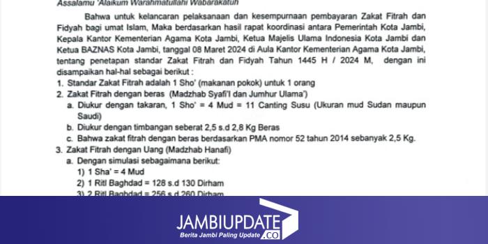 Berdasarkan hasil rapat pada 8 Maret 2024 di Aula Kantor Kementerian Agama Kota Jambi, tentang penetapan standar zakat fitrah dan fidyah 1445 H/2024 M, ada beberpa hal yang disepakati.