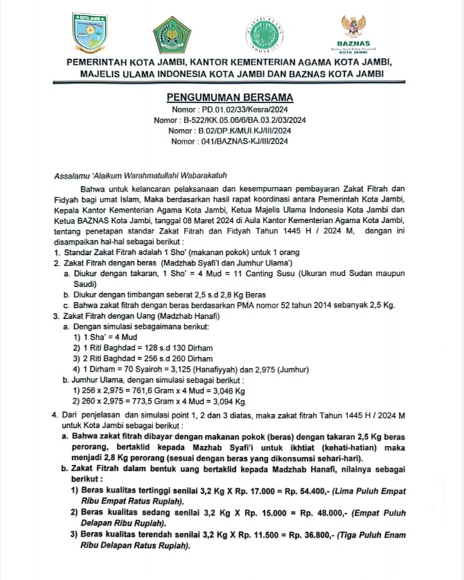 JAMBIUPDATE CO, JAMBI- Pemerintah Kota Jambi bersama Kantor Kementerian Agama Kota Jambi, Majelis Ulama Indonesia (MUI) Kota Jambi dan Baznas Kota Jambi mengeluarkan pengumuman bersama terkait zakat fitrah 1445 H/2024 M.
