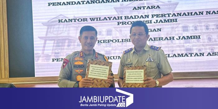 JAMBIUPDATE.CO, JAMBI- Guna memperkuat sinergi para penegak hukum bidang pertanahan, Polda Jambi dan Kanwil BPN Provinsi Jambi lakukan Penandatanganan Naskah Perjanjian Kerjasama antara Polda Jambi dengan Kantor Wilayah BPN Provinsi Jambi tentang Penegakkan Hukum dan Penyelamatan Aset Polri pada Selasa, (19/3).