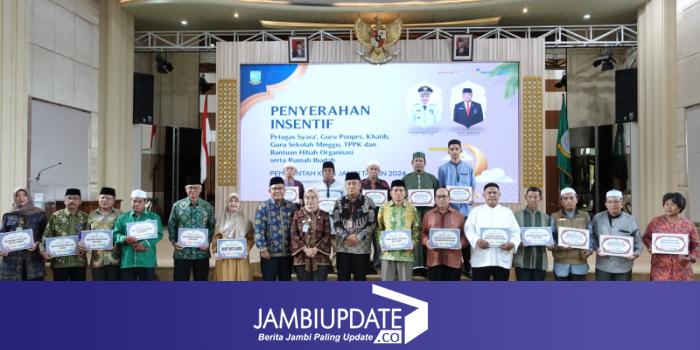 JAMBIUPDATE.CO, JAMBI- Penjabat Wali Kota Jambi Sri Purwaningsih menyerahkan secara simbolis Insentif Petugas Syara yang terdiri dari Imam, Muadzin, Pemandi Jenazah, Penggali Kubur, Khotib Jumat, Guru Pondok Pesantren, TPPK dan Guru Sekolah Minggu Pemerintah Kota Jambi Tahun 2024.