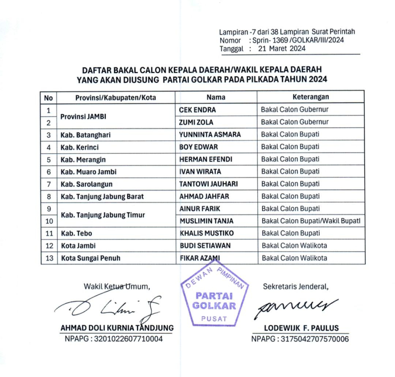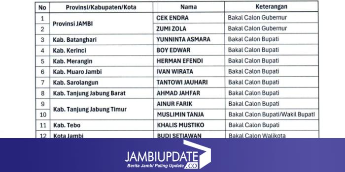 JAMBIUPDATE.CO, JAMBI- Nama-nama calon kepala daerah (Cakada) yang akan disung partai Golkar Pemilihan Kepala Daerah (Pilkada) 2024 kembali beredar. Mulai kandidat bakal calon gubernur, bakal calon bupati dan bakal calon walikota di 11 kabupaten/kota.