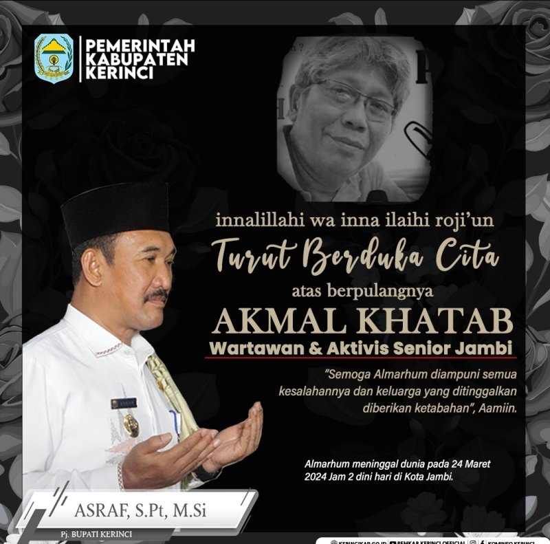 JAMBIUPDATE.CO, JAMBI- Penjabat (Pj) Bupati Kerinci Asraf ikut berduka mendalam atas kepergian wartawan sekaligus aktivis senior Provinsi Jambi Akmal Khatab. Almarhum wafat pada hari ini, Minggu (24/3) pukul 02.00 dinihari di Kota Jambi.