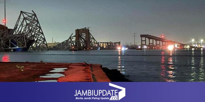 JAMBIUPDATE.CO,- Jembatan Francis Scott Key sepanjang 2,57 kilometer di Kota Baltimore, Maryland, Amerika Serikat ambruk pada Selasa dini hari 26 Maret 2024, setelah sebuah kapal kargo menabraknya. Pejabat setempat menyebut kecelakaan ini menyebabkan tujuh orang jatuh ke dalam sungai.