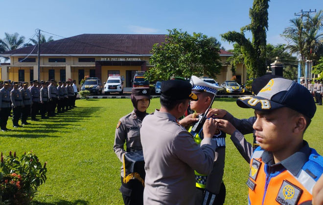 Kapolres Tanjabtim, AKBP Heri Supriawan saat menyematkan tanda kepada peronil pengamanan arus mudik dalam Operasi Ketupat tahun 2024.