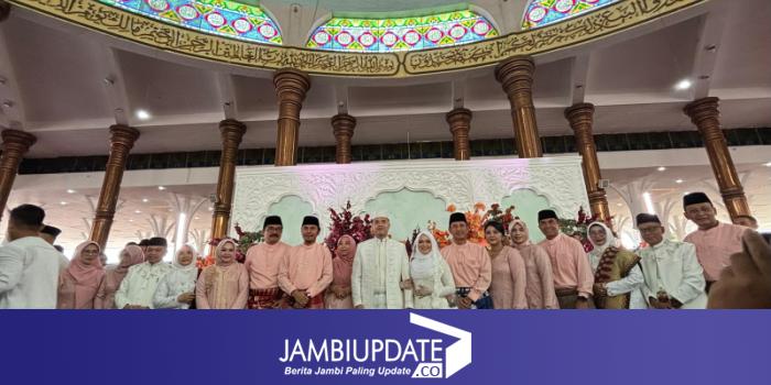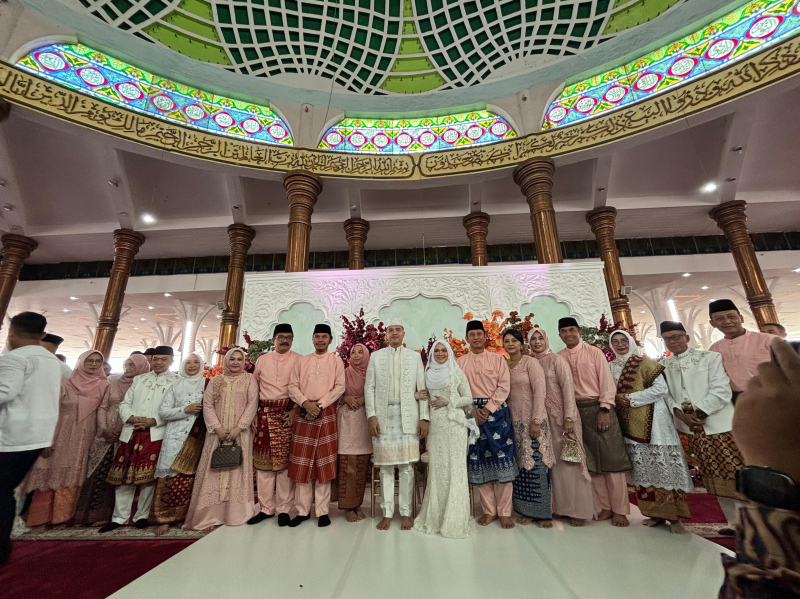JAMBIUPDATE.CO, JAMBI- Ketua DPRD Provinsi Jambi, Edi Purwanto bersama istri menghadiri akad nikah Esy Risdianti, putri sulung Gubernur Jambi Al Haris, Jumat (19/4). Proses akad nikah bersama dengan Muhammad Iqbal Putra berlangsung di Masjid Agung Al Falah Jambi.
