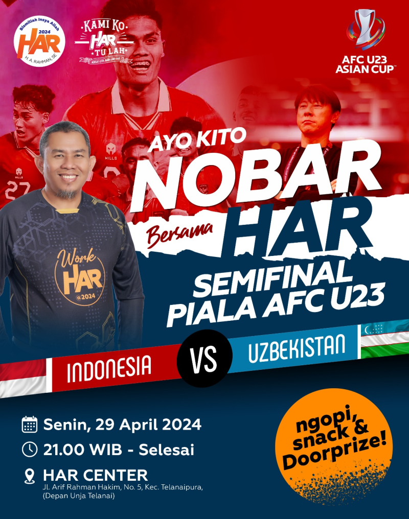 Dikatakan HAR, saat nobar nanti akan disediakan snack doorprize menarik. "Mari kita dukung timnas. Semoga timnas lolos ke Final dan bisa lolos Olimpiade 2024," katanya.