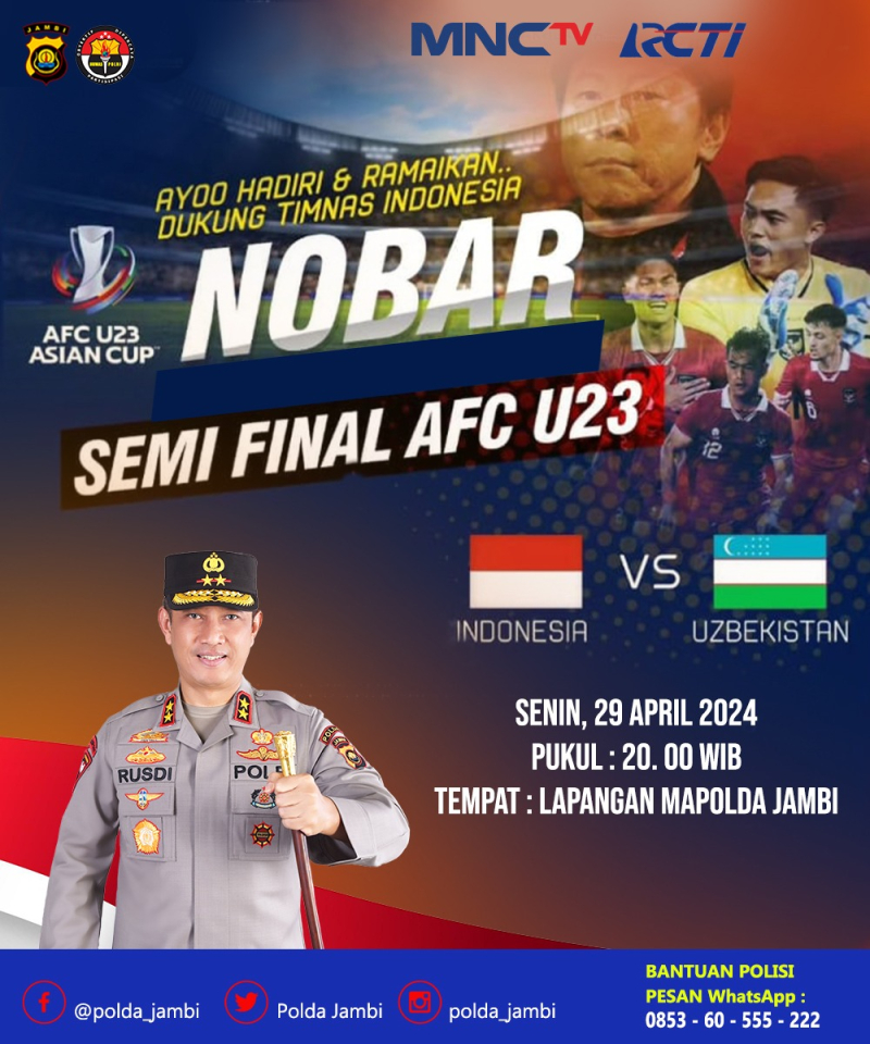 JAMBIUPDATE.CO, JAMBI- Kepolisian Daerah (Polda) Jambi menggelar nonton bareng semifinal Piala AFC Indonesia vs Uzbekistan malam ini, Senin (29/4).
