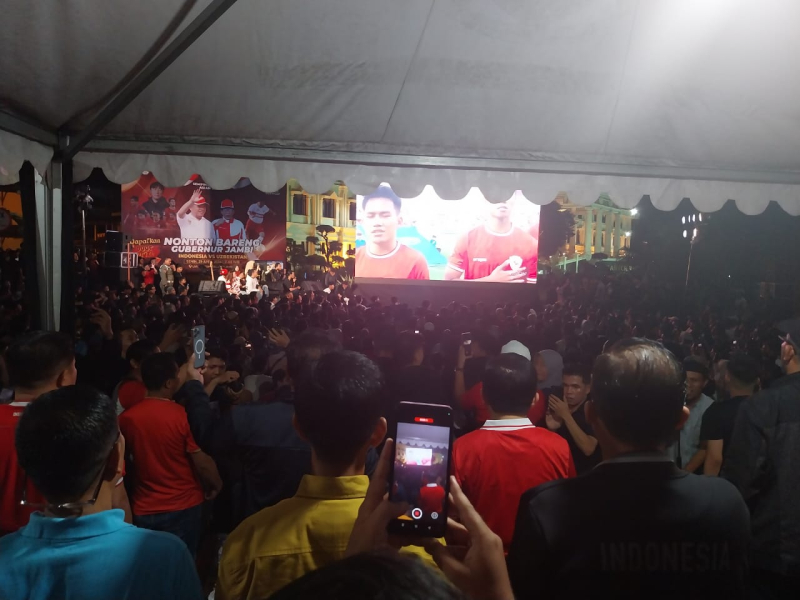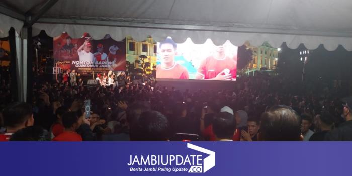 JAMBIUPDATE.CO, JAMBI- Nonton Bareng (Nobar) Timnas Indonesia versus Uzbekistan di Semifinal Piala Asia U-23 di Kantor Gubernur Jambi Senin (29/4) disambut antusias masyarakat. Warga merasakan ada wadah nasionalisme yang disediakan Pemprov Jambi untuk mengungkapkan nasionalisme.