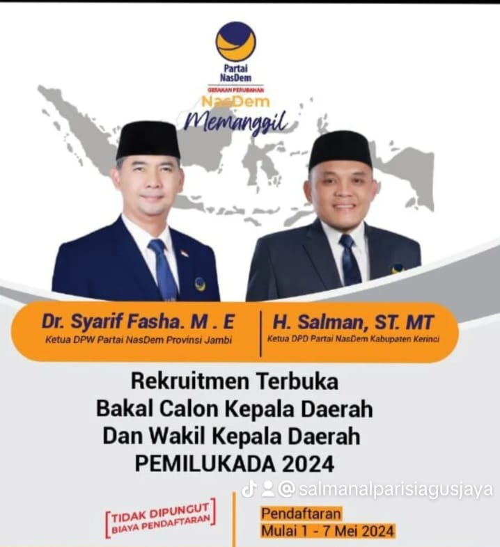 JAMBIUPDATE.CO, JAMBI- DPD Partai NasDem Kabupaten Kerinci membuka penjaringan Bakal Calon Kepala Daerah (Bacakada) untuk Pemilihan Kepala Daerah (Pilkada) 2024. Penjaringan ini dibuka selama satu Minggu, mulai dari tanggal 1 s/d 7 Mei mendatang.