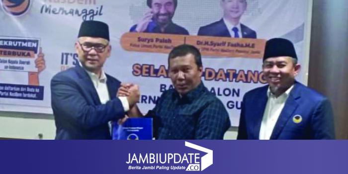 JAMBIUPDATE.CO, JAMBI- Bakal Calon Gubernur (Bacagub) Jambi Romi Hariyanto mengambil keputusan untuk meminang NasDem pada pemilihan gubernur (Pilgub) Jambi 2024. Didampingi tim pemenangan dan relawan, Romi Hariyanto mengembalikan formulir penjaringan dan resmi mendaftar di partai besutan Surya Paloh tersebut.