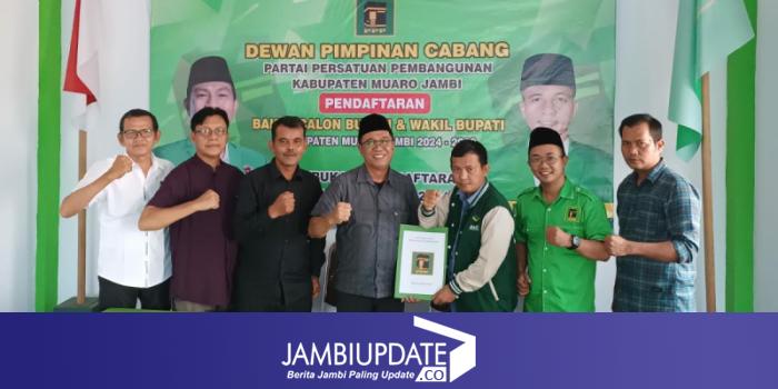 JAMBIUPDATE CO, JAMBI- Kandidat bakal calon Bupati Muaro Jambi, Firmansyah, Kamis (9/5/2024) mengambil formulir pendaftaran calon bupati di Kantor DPC Partai Persatuan Pembangunan (PPP) Muaro Jambi. Dirinya datang dengan didampingi oleh tim kampanyenya.