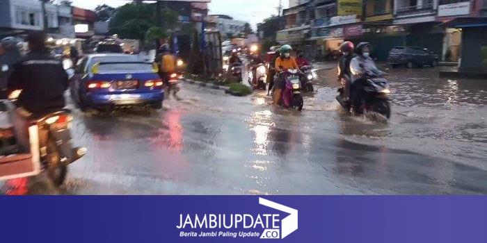 JAMBIUPDATE.CO, JAMBI- Genangan air di jalanan dalam Kota Jambi belum teratasi. Beberapa titik jalan protokol menjadi langganan genangan air ketika terjadi hujan deras.