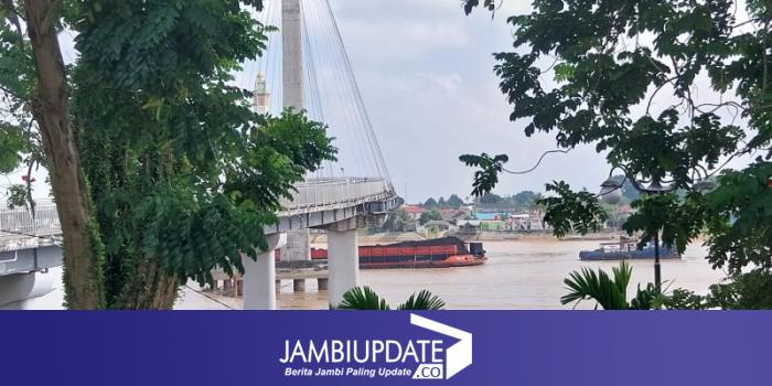 iklan Sisa tongkang yang tertahan di Tembesi melakukan pengangkutan batu bara di Sungai Batanghari. Terlihat melintas di bawah Jembatan Pedestrian Gentala Arasy pada (28/5/2024).