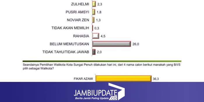 Fikar Azami unggul jauh meninggalkan kandidat petahana Ahmadi Zubir maupun Alvia Santoni (Antos). Bahkan posisi Ahmadi Zubir terjun bebas dengan hanya 11,3 persen, masih kalah dari Antos di posisi kedua dengan 13,5 persen.