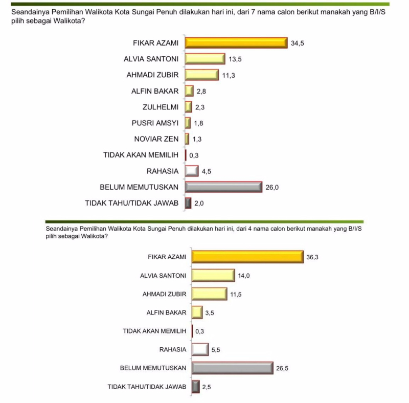 Dalam simulasi pertanyaan tertutup untuk 7 nama calon walikota, Fikar Azami tak terbendung. Ketua DPD II Golkar Sungai Penuh berada pada posisi puncak dengan 34,5 persen.