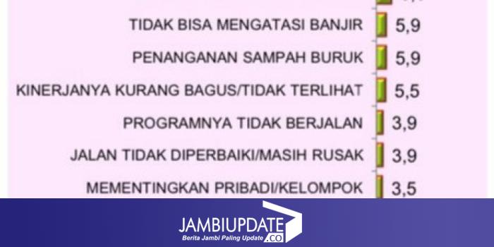 Sisanya menjawab kerja yang kurang bagus 5,5 persen, program tidak berjalan 3,9 persen, jalan tidak diperbaiki 3,9 persen, mementingkan pribadi 3,5 persen, bantuan kurang merata 2,0 persen dan tata kota amburadul 1,6 persen.