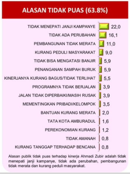 Usut punya usut, tingginya angka ketidakpuasan terhadap Ahmadi disebabkan oleh beberapa faktor. Tidak menepati janji kampanye berada pada urutan pertama dengan skor tertinggi 22,0 persen.