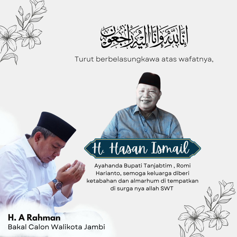 JAMBIUPDATE.CO, JAMBI-Provinsi Jambi kembali berduka. Salah satu putra terbaiknya, seorang tokoh masyarakat sekaligus politisi senior, H Hasan Ismail, yang juga orang tua dari Bupati Tanjab Timur (Tanjabtim) Romi Haryanto, menghadap Sang Khalik.