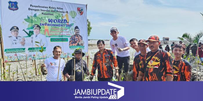JAMBIUPDATE.CO, KUALATUNGKAL - Peringatan Hari Lingkungan Hidup Sedunia diisi Majelis Pimpinan Cabang (MPC) Pemuda Pancasila Kab. Tanjab Barat dengan Penanaman Mangrove bersama Pemkab Tanjab Barat, Organisasi Masyarakat dan Organisasi Kepemudaan di Parit 9 Pesisir Desa Tungkal I, Minggu (9/6).