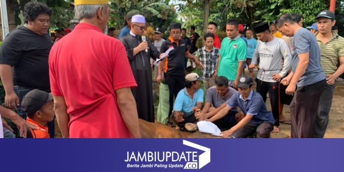 ‘’Satu sapi ini merupakan sumbangan dari Bapak Bupati Tanjab Timur H Romi Haryanto, kito doakan semoga bapak Romi sekeluarga sehat wal afiat dan dimurahkan rezeki oleh Allah,’’ ujar Ketua RT 14 Kenali Asam yang juga Ketua Pujakesuma Provinsi Jambi H Suparyono saat memimpin proses pemotongan hewan qurban tersebut.