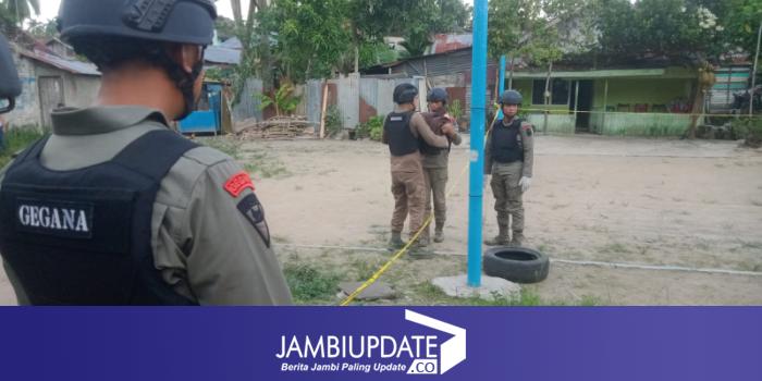 JAMBIUPDATE.CO, JAMBI- Tim Jibom Gegana Brimob Polda Jambi tiba di lokasi penemuan benda yang diduga Granat di Kelurahan Legok kecamatan Danau Sipin.