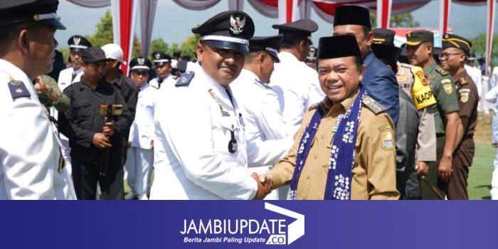 JAMBIUPDATE.CO, BUKIT TENGAH - Gubernur Jambi Dr. H. Al Haris, S.Sos, MH menghadiri dan menyaksikan Pengukuhan Perpanjangan 2 tahun masa jabatan Kepala Desa se-Kabupaten Kerinci oleh Pj. Bupati Kerinci, Asraf. Pengukuhan masa perpanjangan 285 Kades menjadi 8 tahun ini berlangsung di Depan Kantor Bupati Kerinci, Bukit Tengah, Siulak Mukai, Kabupaten Kerinci, Senin (15/07/2024).