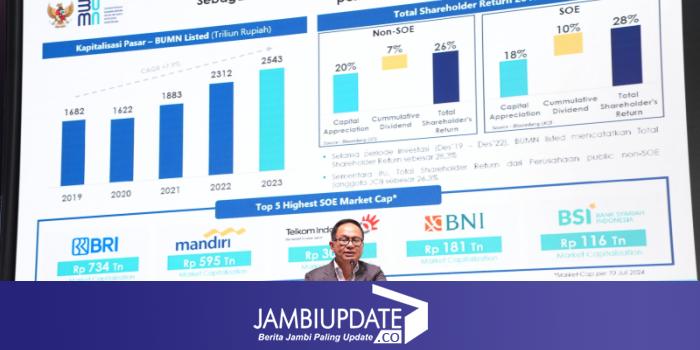 JAMBIUPDATE.CO,- Jakarta, 17 Juli 2024— PT Bank Syariah Indonesia Tbk (BSI) telah berhasil masuk dalam jajaran 5 besar Badan Usaha Milik Negara (BUMN)/anak BUMN dengan kapitalisasi pasar terbesar di Indonesia setidaknya per Juli 2024. Di mana kapitalisasi pasar emiten bank berkode saham BRIS tersebut mencapai Rp116 triliun.