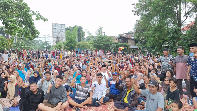 “Alhamdulillah bapak ibu pada hari ini kito bersama berkumpul dengan calon Wali Kota Jambi pilihan kito bapak Haji Abdul Rahman. Setuju kito pilih pak Haji Abdul Rahman bapak ibu? Setuju,” jawab warga.