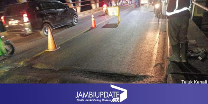Pantauan pada malam Senin (22/7) Tampak pekerja melakukan pekerjaan pemasangan sambungan siar muai pada jembatan yang menghubungkan Kota Jambi dan Kabupaten Muaro Jambi ini.