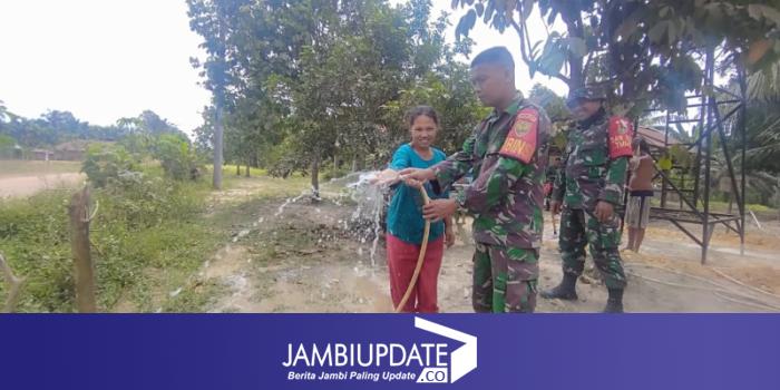 JAMBIUPDATE.CO, JAMBI - Warga Desa Muaro Sebapo, sangat senang lantaran air sumur bor yang dibangun dalam program TNI Manunggal Membangun Desa (TMMD) Ke-121 Kodim 0415/Jambi menyemburkan air.
