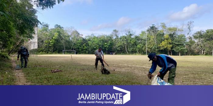 JAMBIUPDATE.CO, JAMBI - Satgas TMMD ke 121 Kodim 0415/Jambi bersama masyarakat gotong royong membersihkan lapangan Sepak Bola Bajaw, di Desa Suka Maju, Kecamatan Mestong, Kabupaten Muaro Jambi, Sabtu (3/8/2024).