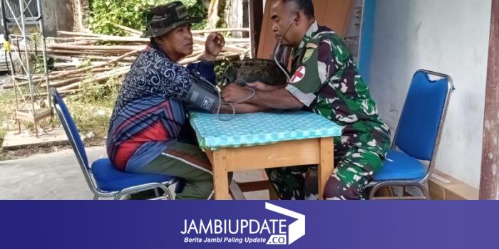 JAMBIUPDATE.CO, JAMBI - Guna menjaga kesehatan agar tetap optimal dalam membangun RTLH, Denkesyah 02.04.02 Kodim 0415/Jambi memberikan pelayanan kesehatan ke Satgas TMMD.