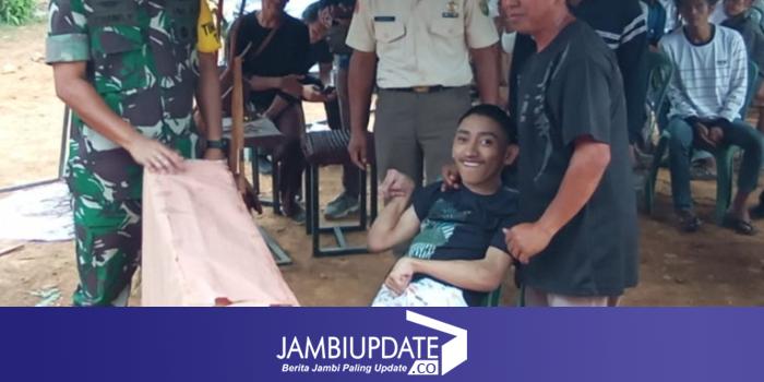 JAMBIUPDATE.CO, JAMBI - Ketua Tim Wasev TMMD, Mayjen TNI Johanis Payung, menyerahkan bantuan kursi roda bagi seorang anak penderita lumpuh bernama Yazdan Afdholy di lapangan Desa Suka Maju, Kecamatan Mestong, Kabupaten Muaro Jambi.