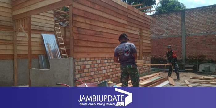 JAMBIUPDATE CO, JAMBI - Pembangunan rumah layak huni Milik Nenek Komsiah warga Desa Muaro Sebapo, Kecamatan Mestong, masuk tahap pemasangan atap.
