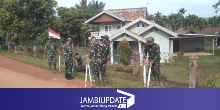 JAMBIUPDATE.CO, JAMBI - Satuan Tugas (Satgas) TMMD Ke-121 Kodim 0415/Jambi penuh semangat kebersamaan dengan warga serta mahasiswa, bahu-membahu membersihkan lapangan dan membuat pagar jalan serta memasang bendera dan umbul-umbul dalam rangka Kemerdekaan Republik Indonesia yang ke 79, Senin (12/8/2024).