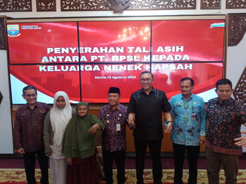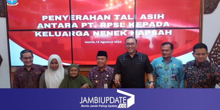 Bertempat di rumah dinas Gubernur Jambi, Kamis (15/8/2024) dilakukan penyerahan tali asih oleh petinggi PT.RPSL kepada keluarga Nenek Hapsah yang diwakili cucunya Faradilla Hapsah dan anak nenek Hapsah bernama Roliah. Adapun tali asih yang senilai Rp600 juta itu merupakan ganti rugi rusaknya rumah nenek Hapsah akibat dampak aktivitas angkutan PT.RPSL.