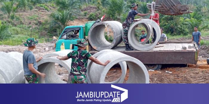 JAMBIUPDATE.CO, JAMBI - Kekompakan dan keakraban terlihat antara Personil Satgas TNI Manunggal Membangun Desa (TMMD) ke 121 Kodim 0415/Jambi bersama dan masyarakat saat memindahkan gorong-gorong.