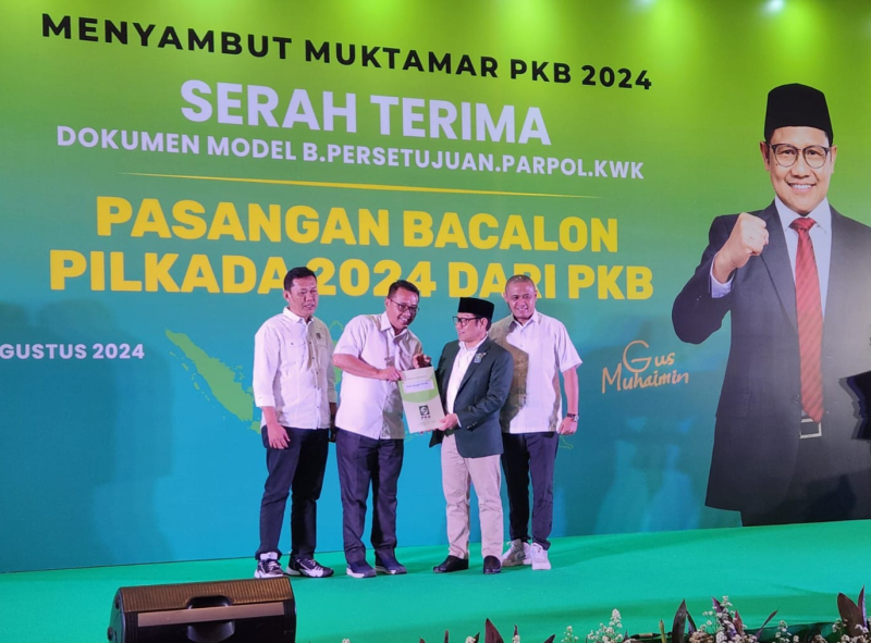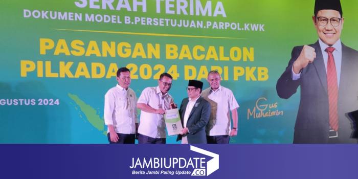 JAMBIUPDATE.CO, SUNGAI PENUH- PKB Resmi mengusung Alfin-Azhar di Pilwako Sungai Penuh. SK rekomendasi dukungan itu diserahkan langsung oleh Ketua Umum PKB Muhaimin Iskandar, Minggu (18/8/2024).