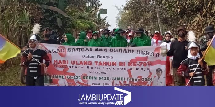 JAMBIUPDATE.CO, JAMBI - Ribuan masyarakat di Desa Suka Maju mengikuti jalan sehat berhadiah, dalam rangka HUT RI ke 79 dan program TMMD ke 121 Kodim 0415/Jambi, Minggu (18/8/2024).