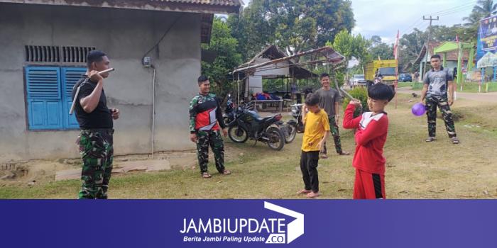 JAMBIUPDATE.CO, JAMBI - Satgas TMMD ke 121 Kodim 0415/Jambi bersama anak anak di Desa Suka Maju, melakukan latihan "Nunchaku" atau Doble stik di depan rumah orang tua asuh.