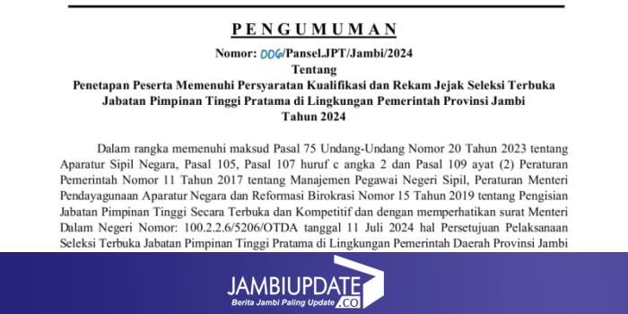 Hal ini dikonfirmasi oleh Kepala Badan Kepegawaian Daerah (BKD) Provinsi Jambi Henrizal. Adapun total pelamar sebanyak 70 orang, dimana hanya 67 yang memenuhi persyaratan. "Ada 3 pelamar yang tak lolos administrasi," jelas Henrizal kepada Jambi Ekspres (27/8/2024).