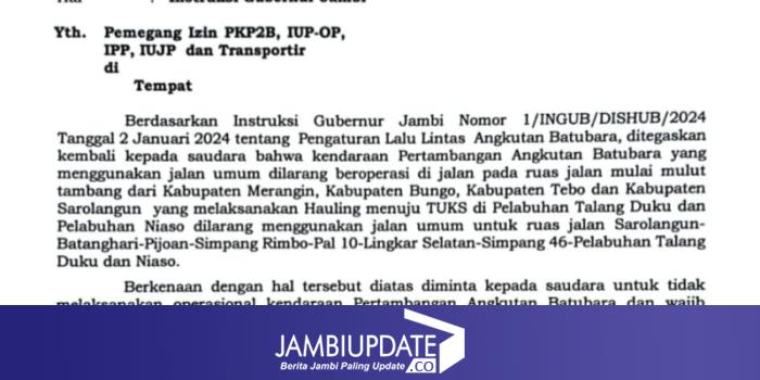 "Berdasarkan Instruksi Gubernur Jambi Nomor 1/INGUB/DISHUB/2024 Tanggal 2 Januari 2024 tentang Pengaturan Lalu Lintas Angkutan Batubara, ditegaskan kembali kepada saudara bahwa kendaraan Pertambangan Angkutan Batubara yang menggunakan jalan umum dilarang beroperasi di jalan pada ruas jalan mulai mulut tambang dari Kabupaten Merangin, Kabupaten Bungo, Kabupaten Tebo dan Kabupaten Sarolangun yang melaksanakan Hauling menuju TUKS di Pelabuhan Talang Duku dan Pelabuhan Niaso dilarang menggunakan jalan umum untuk ruas jalan Sarolangun- Batanghari-Pijoan-Simpang Rimbo-Pal 10-Lingkar Selatan-Simpang 46-Pelabuhan Talang Duku dan Niaso," bunyi petikan Ingub itu.