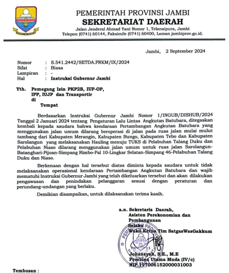 Surat yang ditandatangani Sekda Provinsi Jambi Sudirman yang diwakili Asisten II Setda Provinsi Jambi Johansyah itu menerangkan, penegasan kepada para pihak bahwasanya kendaraan Pertambangan Angkutan Batubara yang menggunakan jalan umum dilarang beroperasi di jalan pada ruas jalan yang telah ditentukan sebelumnya.