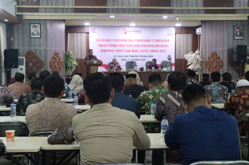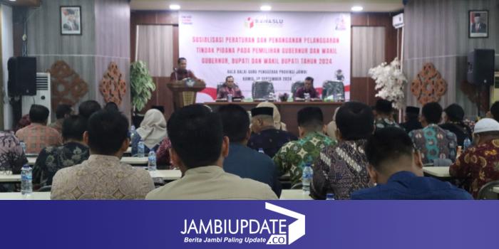 JAMBIUPDATE.CO, BATANGHARI- Badan Pengawas Pemilihan Umum (Bawaslu) Kabupaten Batanghari menggelar sosialisasi Peraturan dan Penanganan Pelanggaran Tindak Pidana Pada Pemilihan Gubernur dan Wakil Gubernur, Bupati dan Wakil Bupati Tahun 2024 bersama seluruh Kepala Desa dan Lurah Se- Kabupaten Batanghari bertempat di Balai Guru Penggerak Provinsi Jambi. Kamis (12/09).