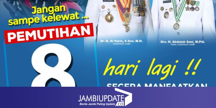 JAMBIUPDATE.CO, JAMBI - Delapan hari lagi program pemutihan pajak kendaraan bermotor (PKB) akan berakhir. "Bagi masyarakat yang belum memanfaatkan program ini, segera lunasi tunggakan pajak kendaraan anda," tegas Kepala BPKPD Provinsi Jambi, Agus Pirngadi, S.Sos, Jum'at (20/9).